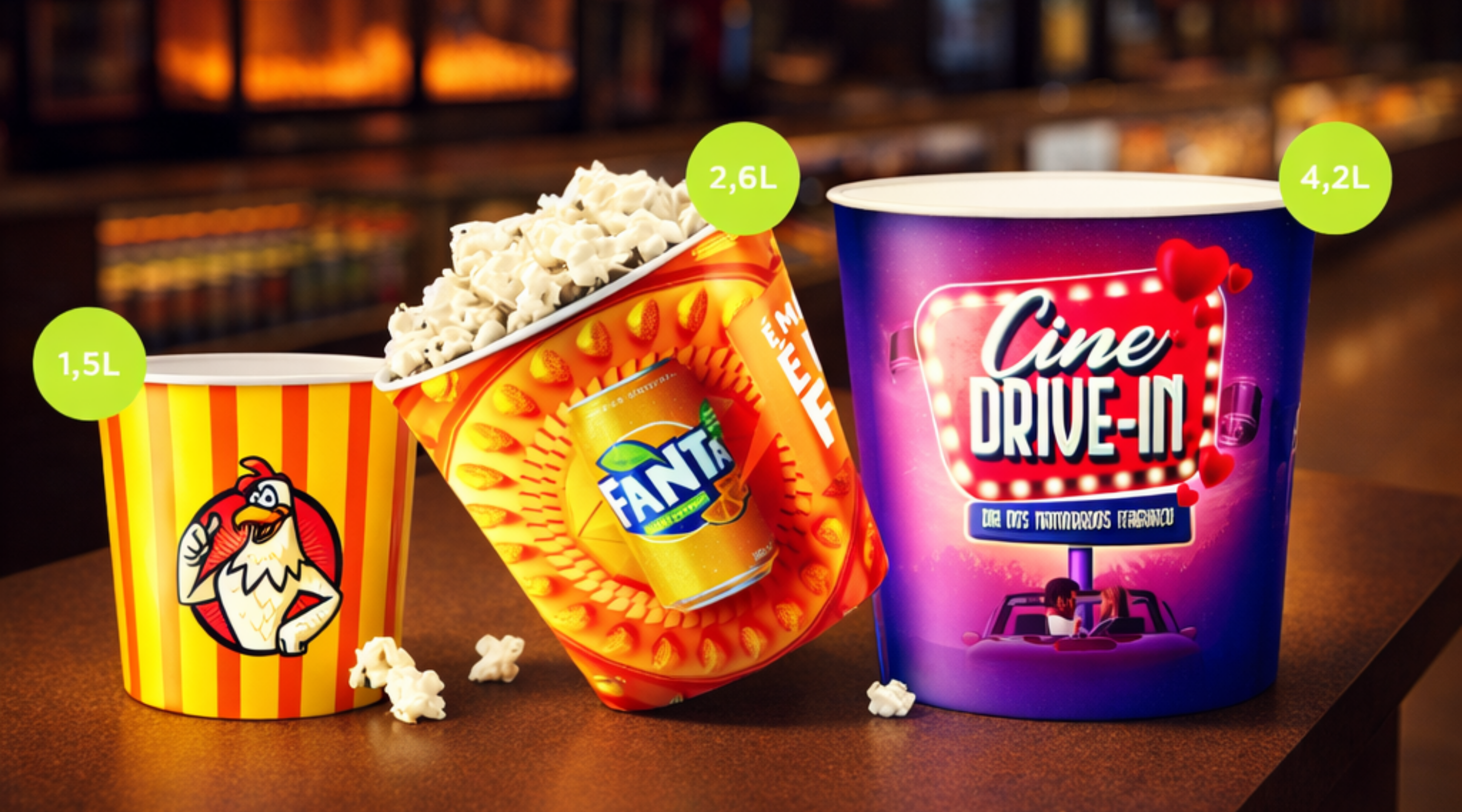 Balde de pipoca personalizado com In Mold Label (IML). Opções 1,5L, 2,6L e 4,2L. Ótimo brinde corporativo para eventos e cinemas.
