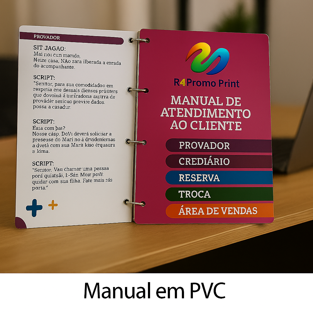 O Manual em PVC é um projeto especial pensado para padronizar rotinas e melhorar o atendimento no ponto de venda. Produzido em PVC, oferece alta durabilidade e um visual profissional, ideal para ficar no balcão, áreas de atendimento e operação.